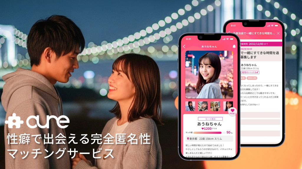 これまでにあったようでなかった性癖マッチングサイト『aune』。セフレ探しにはもっとも重要な性癖を会う前にマッチングさせ、お互いのプレイの相性やNGプレイを100%擦り合わせが出来る本能直結型マッチングサービスです。価値…